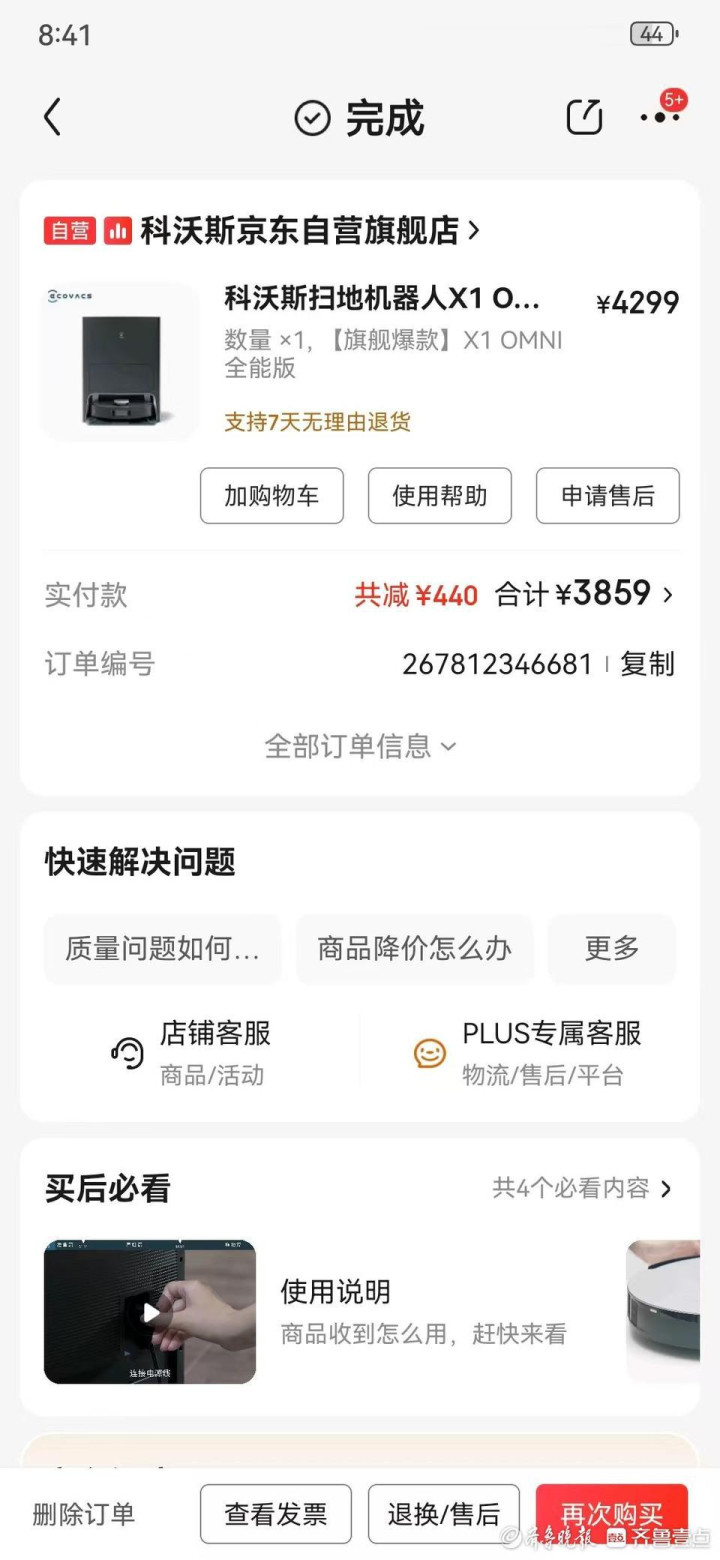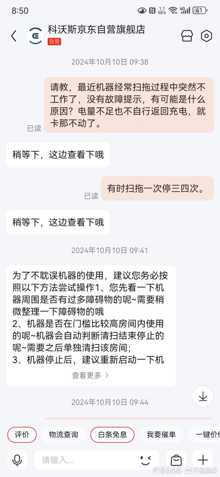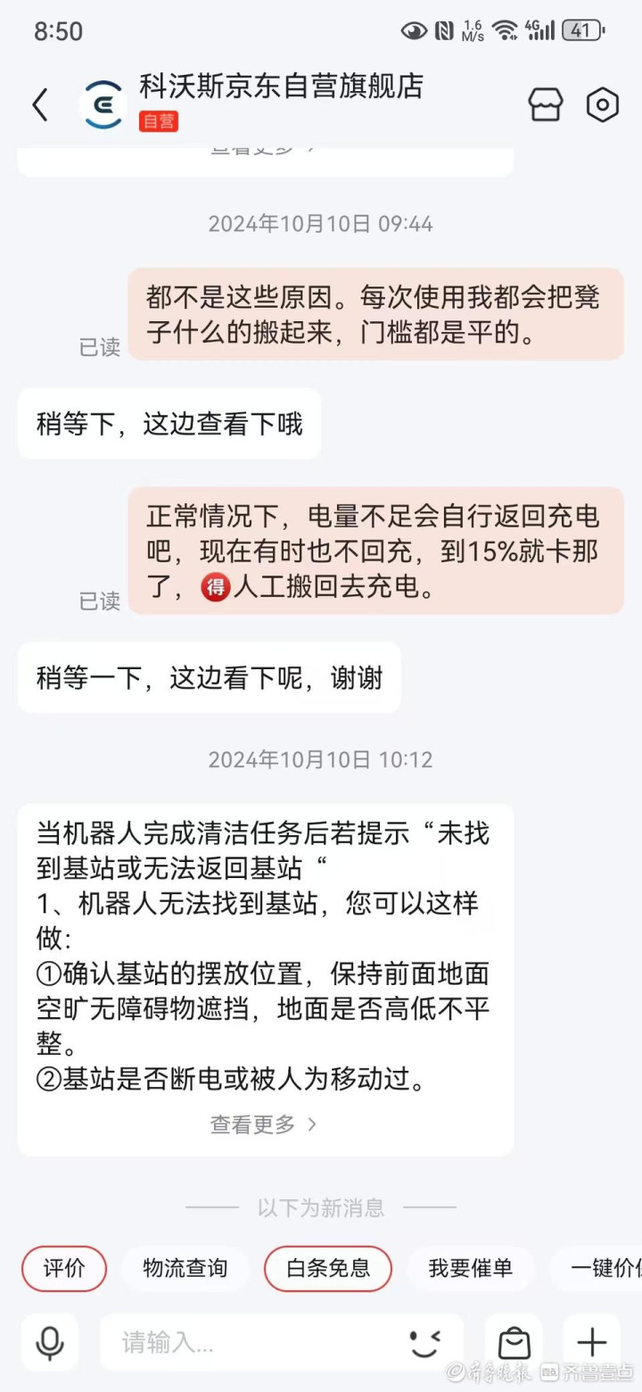 “我看了齐鲁壹点关于王女士反映的情况,虽然我们家的不像她那么严重,直接主板进液坏掉了,但也是经常莫名其妙断网、罢工。”白先生反映,他是2023年4月网购的科沃斯X1OMNI,原价4299元,折扣价是3859元。用了差不多一年的时间,开始陆续出现问题,“扫地机器人我之前也用过,正常来说,快没有电的时候它会自动回去充,充满继续扫拖,完成指定工作。现在显示电量到30%以后就耗得非常快,工作一会可能就会突然没电了,你得手动把它抱回去充电。再有时候机器明明有电,也会出现停止工作的情况,扫拖一次停个三四次。”